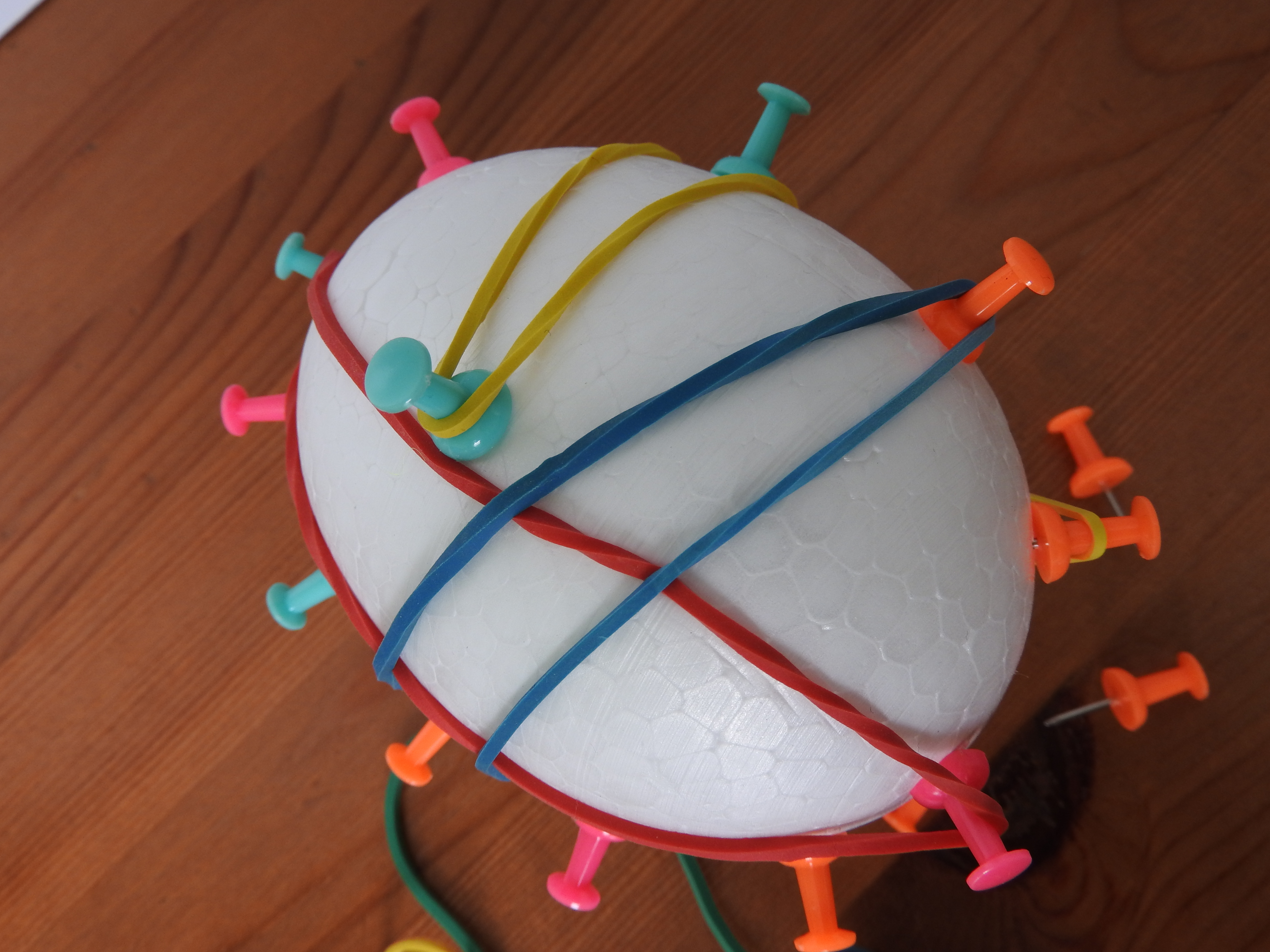 Styropianowe jajo znalazłam przedwczoraj w Pepco, kolorowe pinezki i gumki kupiliśmy będąc na zakupach w Intermarche. Reszta to tylko kwestia pomysłu. Dzieci zwykle nie mają problemów z kreatywnością – a wbijanie pinezek w styropian zawsze wciąga nawet najbardziej znudzonych zajęciami „zawodników”.