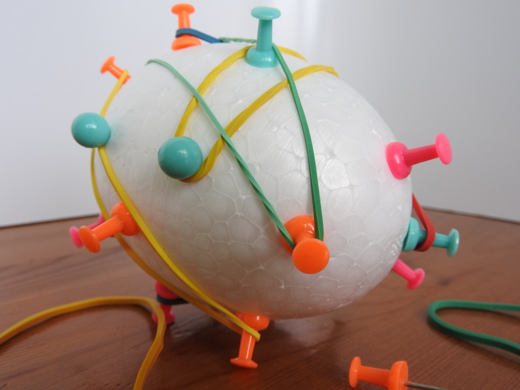 Styropianowe jajko, pinezki i gumki to baza do doskonałej zabawy ćwiczącej motorykę małą. Gumki to dobry materiał ćwiczący zręczność palców wzmacniając mięśnie dłoni