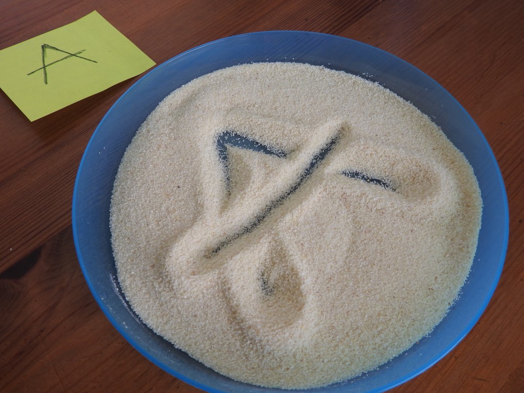 Kasza manna z powodzeniem zastępuje w domu piasek. Łączenie dotyku, obrazu, dźwięku i motoryki małej to doskonałe ćwiczenie multisensoryczne nie tyko dla dzieci z autyzmem ale również dla dzieci dyslektycznych. Pisanie palcem w piasku to stare jak świat podwórkowo-plażowe zabawy, które ze względów technicznych przenosimy pod dachy naszych szkół i przedszkoli