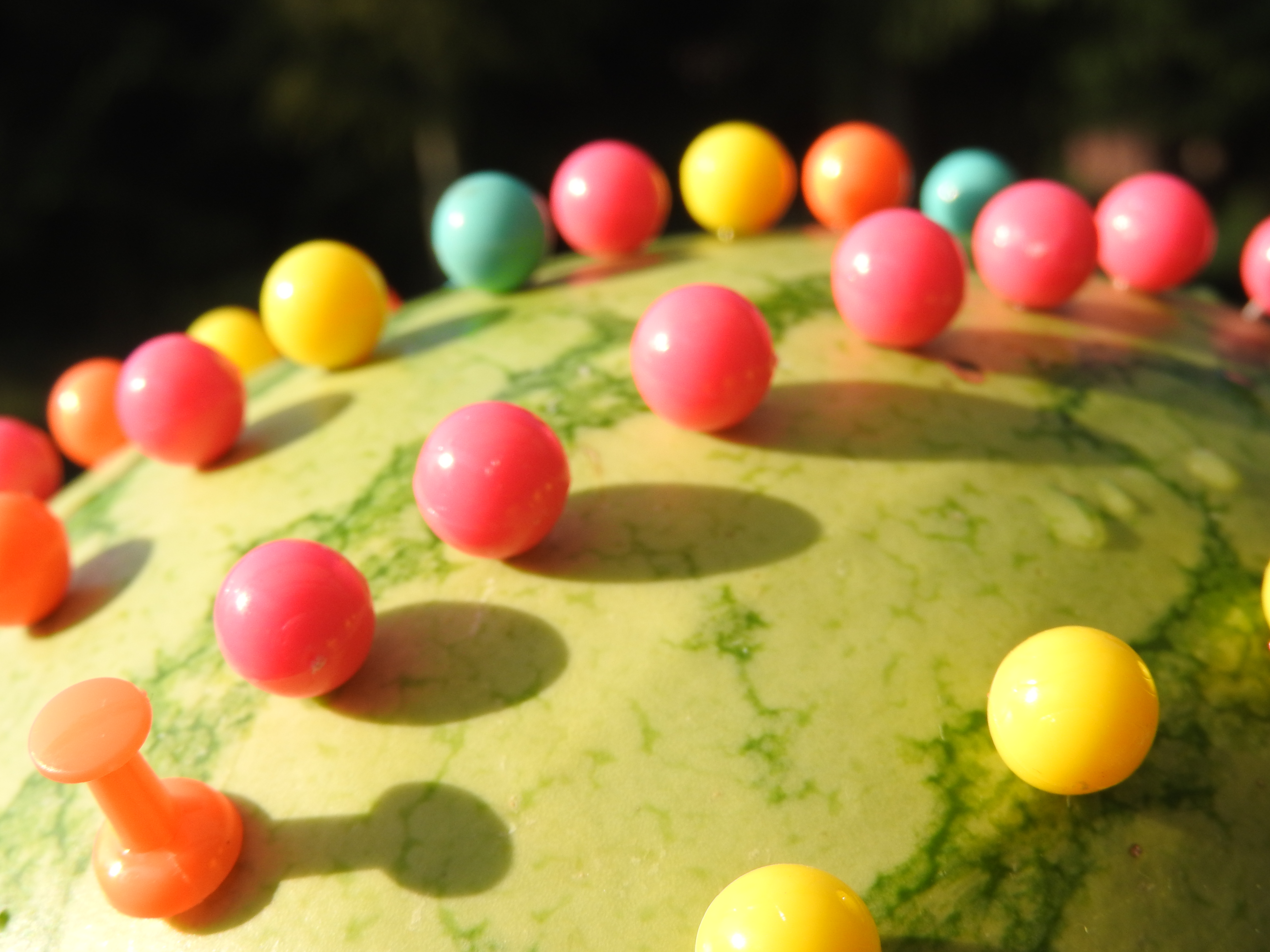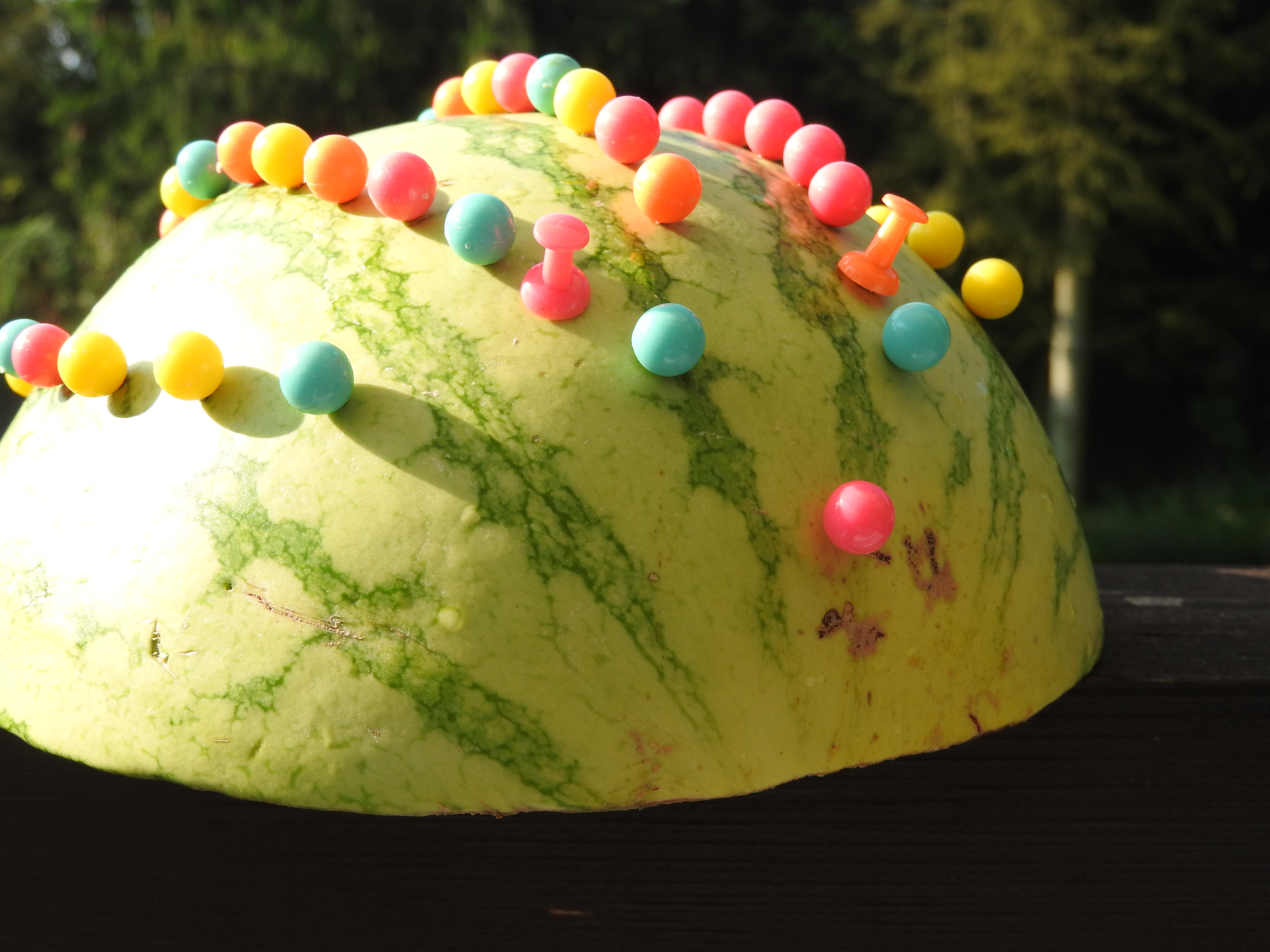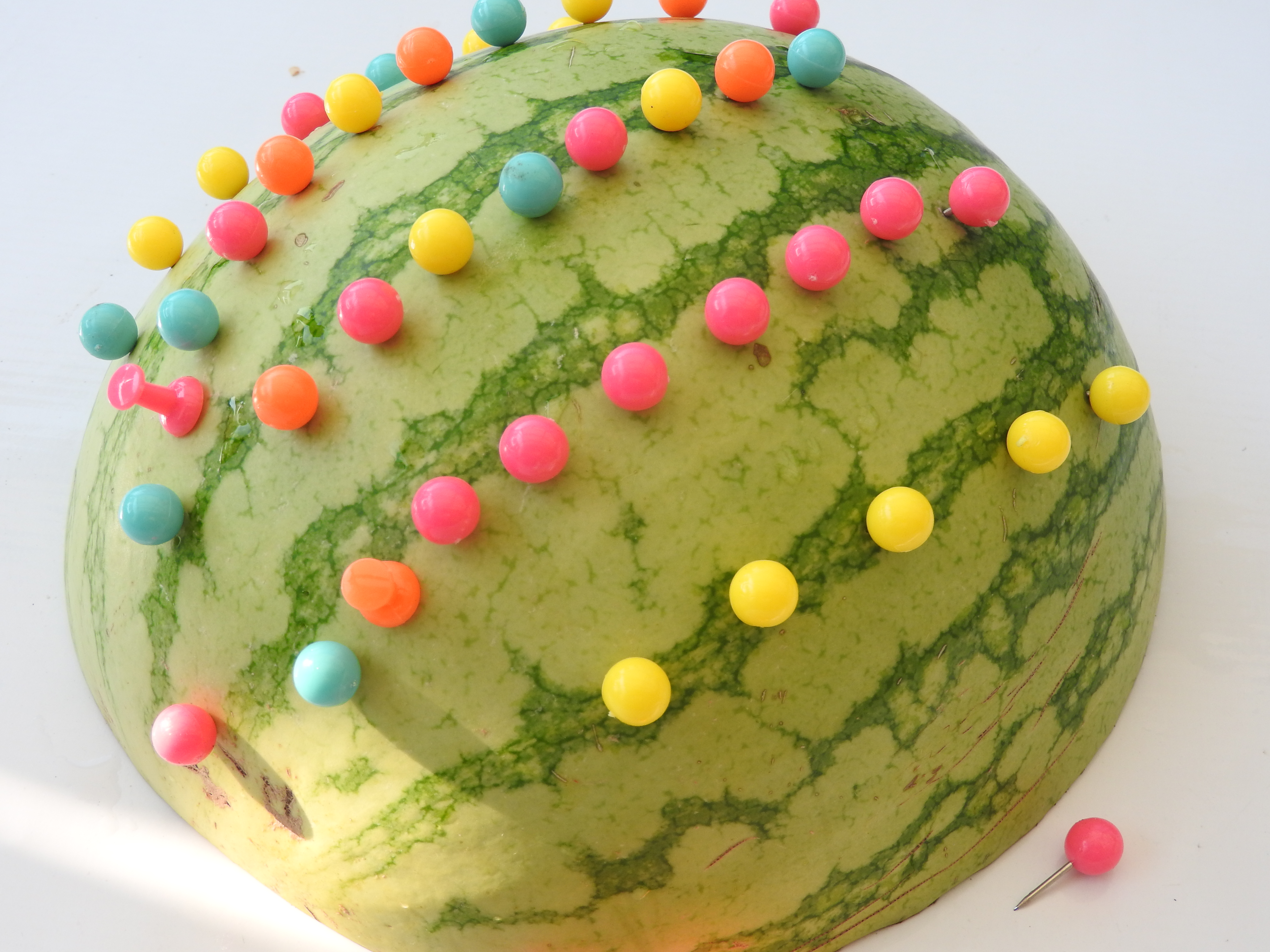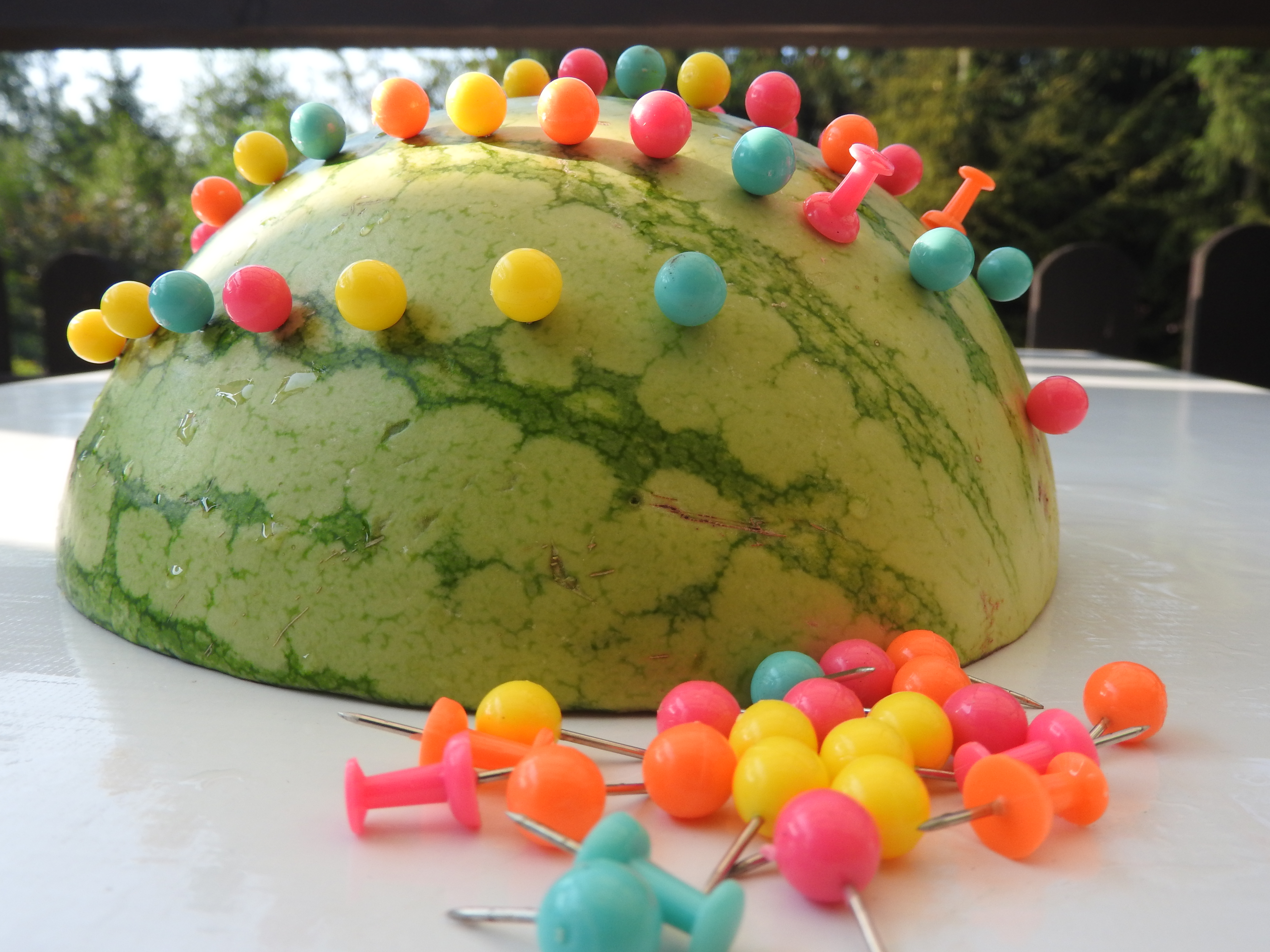 - Wbijaj ostrożnie pinezki w łupinę arbuza tworząc jeżyka z kolcami i buźką lub stwórz inne, wymyślone przez siebie wzory.