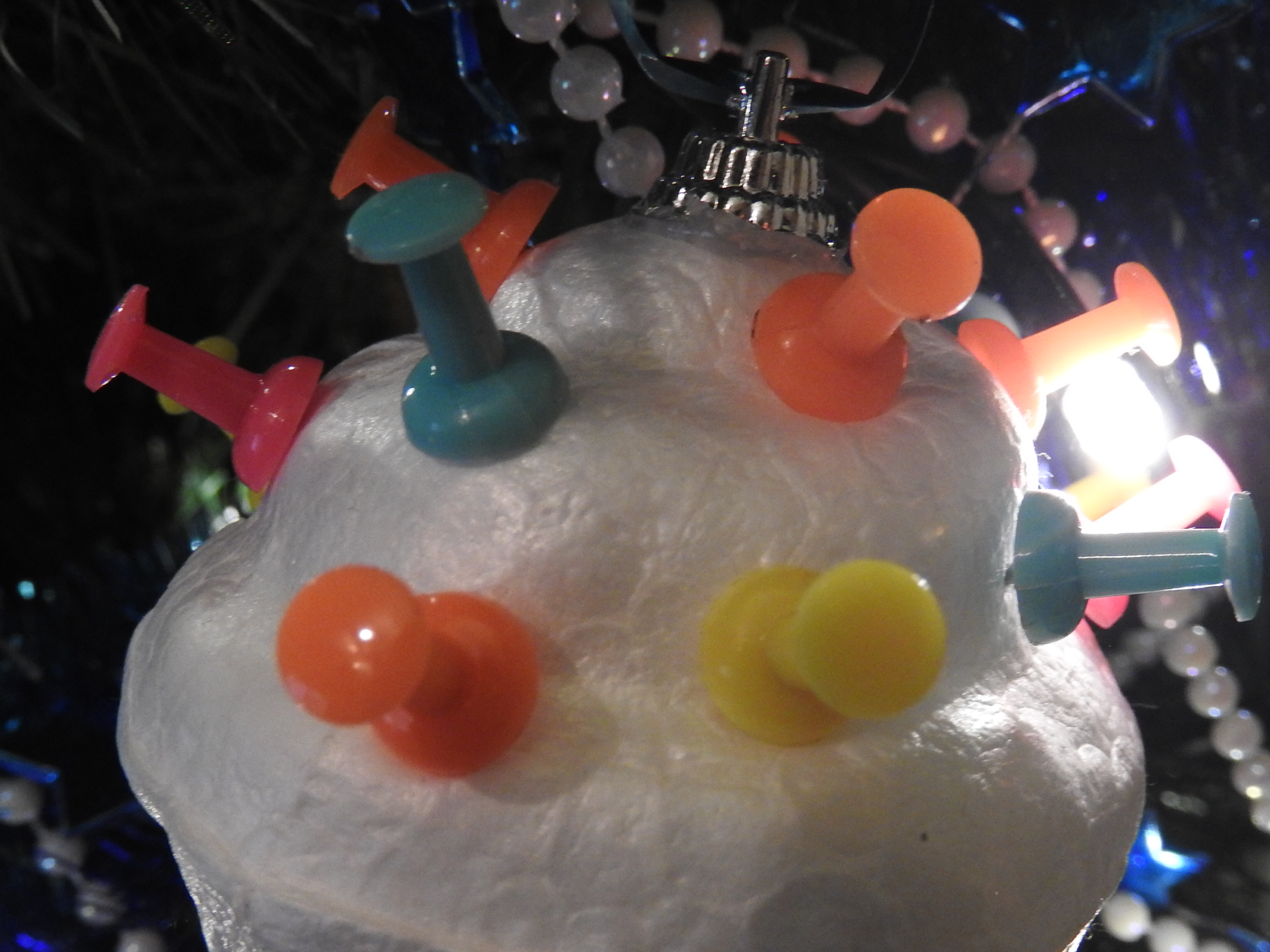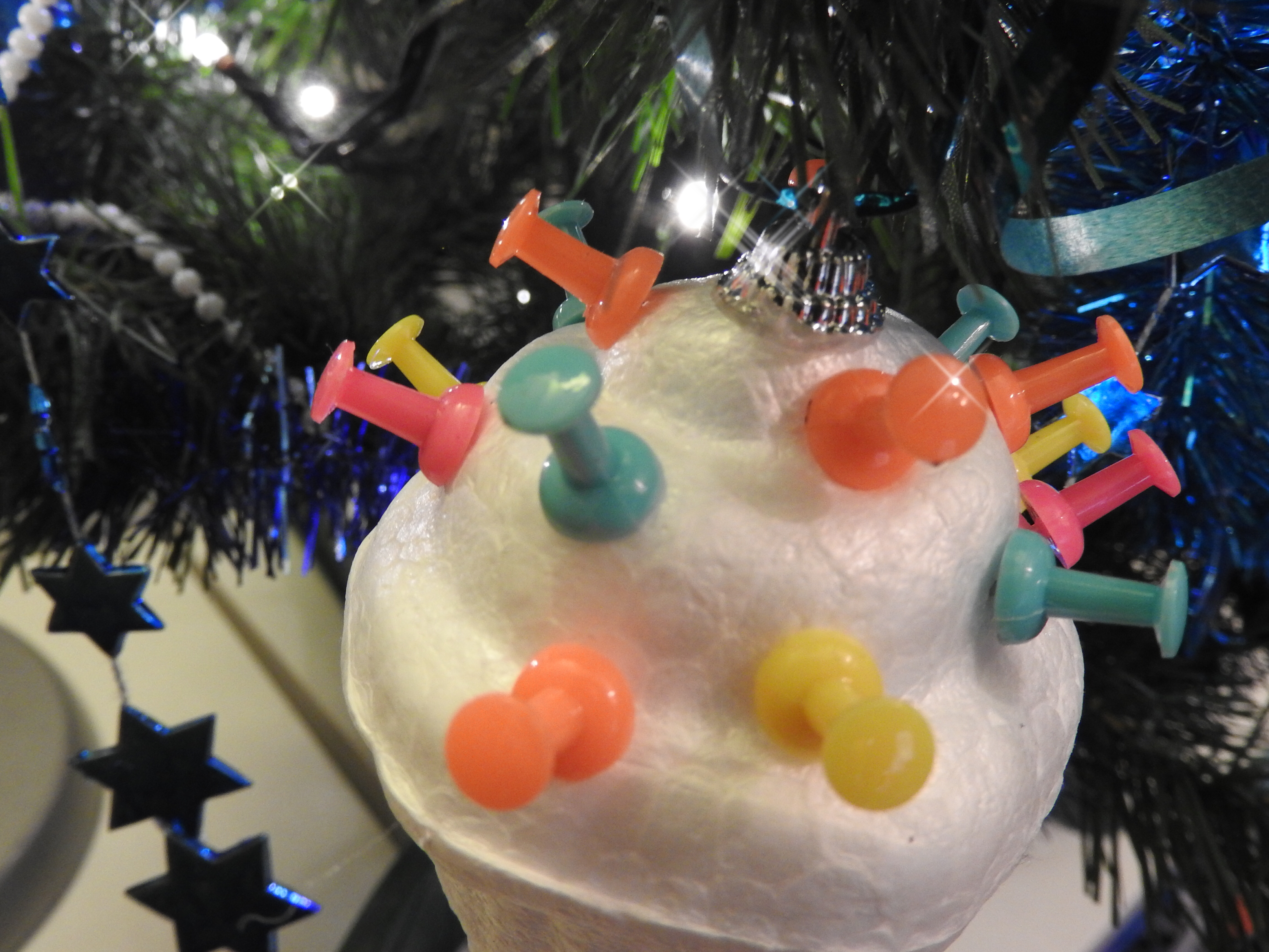 Styropianowe bombki w kształcie babeczek – pomyślałam, że można je przyozdobić nie brudząc rąk, stąd kolejny pomysł z wykorzystaniem pinezek tym razem z podłużnymi uchwytami. To dobre ćwiczenia motoryczno- sensoryczne dla małych i dużych rączek.