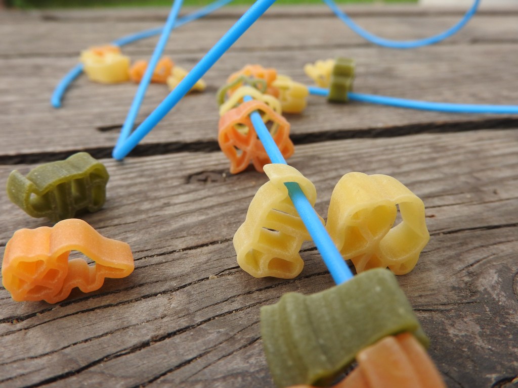 2. Nawlekanie makaron na słomki. Dziecko samodzielnie nawleka makaron, wykonuje zadanie do końca. Potem składa makaron na miejsce („sprząta”).