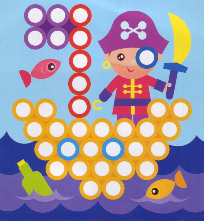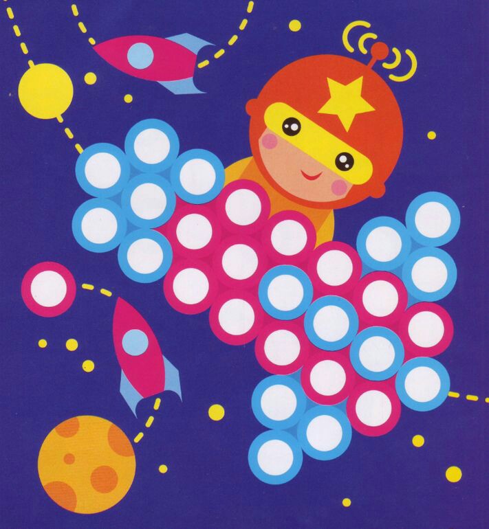 Polecenie: formuj małe kulki z plasteliny i przyklejaj zgodnie z kolorami na wybranym arkuszu.