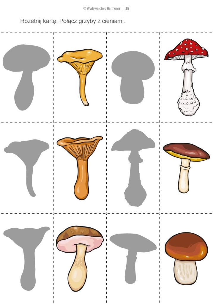 Temat: Poznanie nazw i sposobów rozpoznawania grzybów jadalnych i trujących. Budowa grzyba. Czytanie wiersza Marii Kownackiej „Grzyby” z właściwą intonacją. „Co można zrobić z grzybów” – wypowiedzi na podstawie własnych doświadczeń. Zasady bezpiecznego zbierania grzybów. Nauka posługiwania się atlasem grzybów.