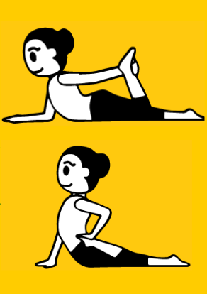 Połóż się na brzuchu. Podciągnij lekko „ogon” pod siebie. Zrób pozycję Sfinksa (21), następnie ugnij prawą nogę w kolanie a prawą rękę przenieś do tyłu i chwyć za stopę przyciągając piętę do pośladka. Rób to bardzo powoli na wydechach, poczujesz jak rozciąga się udo. Otwórz klatkę piersiową i wytrzymaj kilka oddechów. Następnie opuść powoli prawą nogę i powtórz ćwiczenie na drugą nogę – lewa dłoń łapie i przyciąga lewą stopę. Jeśli nie bolą Cię dolne plecy (lędźwia) możesz unieść wyżej tułów i wyciągnąć kręgosłup do góry.