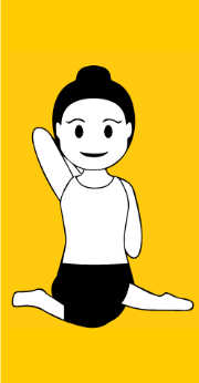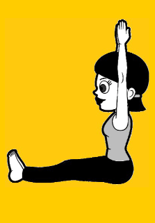 Usiądź w siadzie prostym czyli wyprostuj nogi przed siebie. Zegnij stopy flex – palce stóp na siebie, pięty wypchnij do przodu. Postaraj się całkowicie wyprostować nogi i napiąć mięśnie ud oraz brzucha. Plecy proste, wyciągnij kręgosłup czubkiem głowy. Na głowie możesz położyć sobie woreczek lub książkę. A teraz unieś proste ręce do góry, rozciągnij rękoma boki tułowia, wytrzymaj co najmniej 10 sekund oddychając przez nos. Uśmiechnij się.