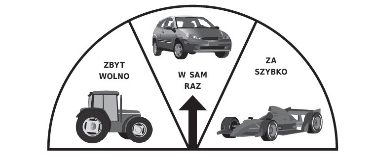 - Rysunek (poniżej) z trzema pojazdami: „zbyt wolno”, „za szybko” i „w sam raz”.