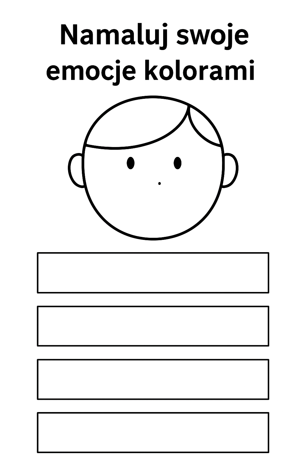 - Twarz z pustym wyrazem emocji – dziecko może domalować minę (uśmiech, smutek, złość) lub zostawić ją neutralną.