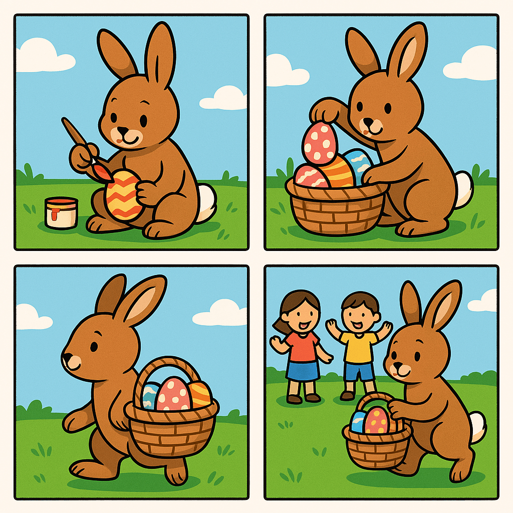 Forma: 4–6 obrazków z prostą opowieścią (np. zajączek maluje pisanki, wkłada do koszyczka, niesie do dzieci)