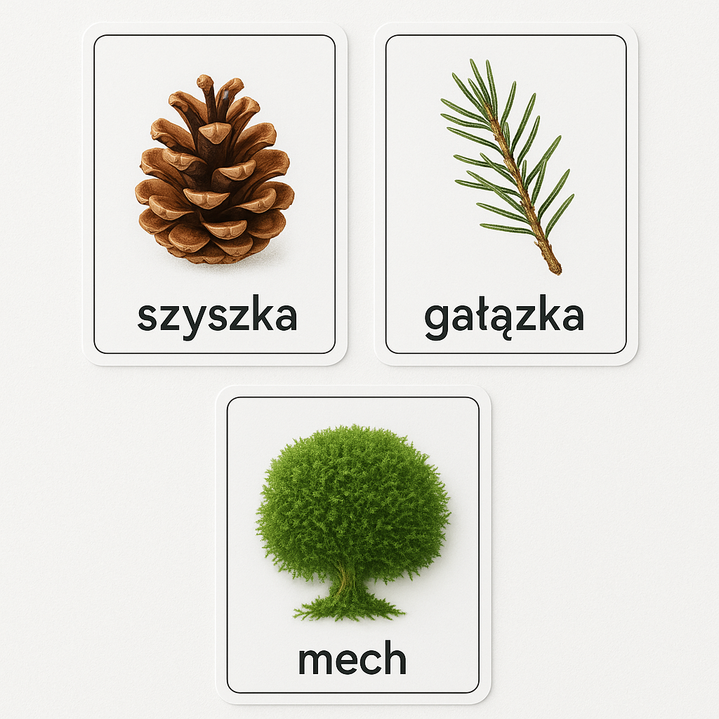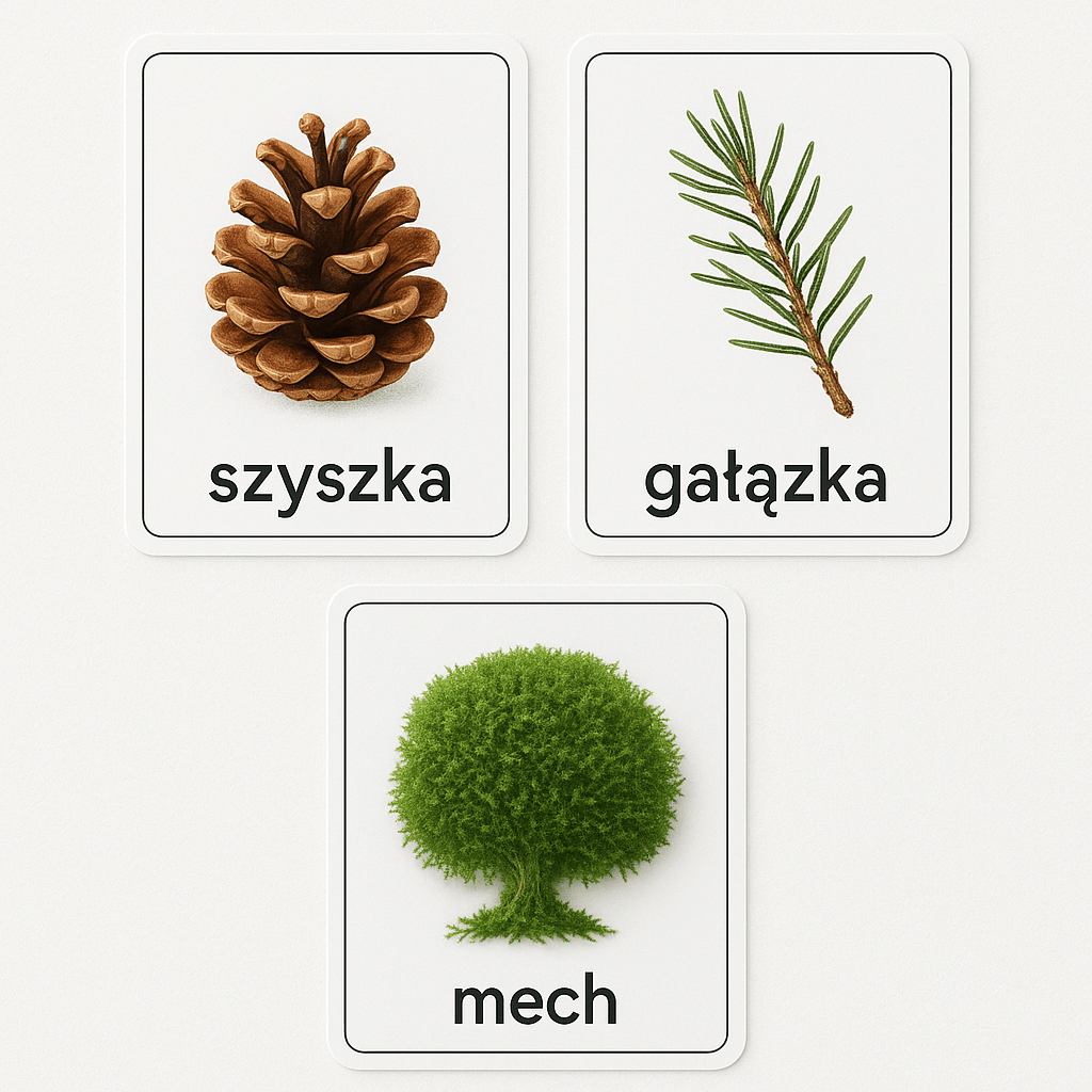 Alt: realistyczne zdjęcia materiałów przyrodniczych – liście, szyszki, kora, mech – w czystym układzie dydaktycznym.