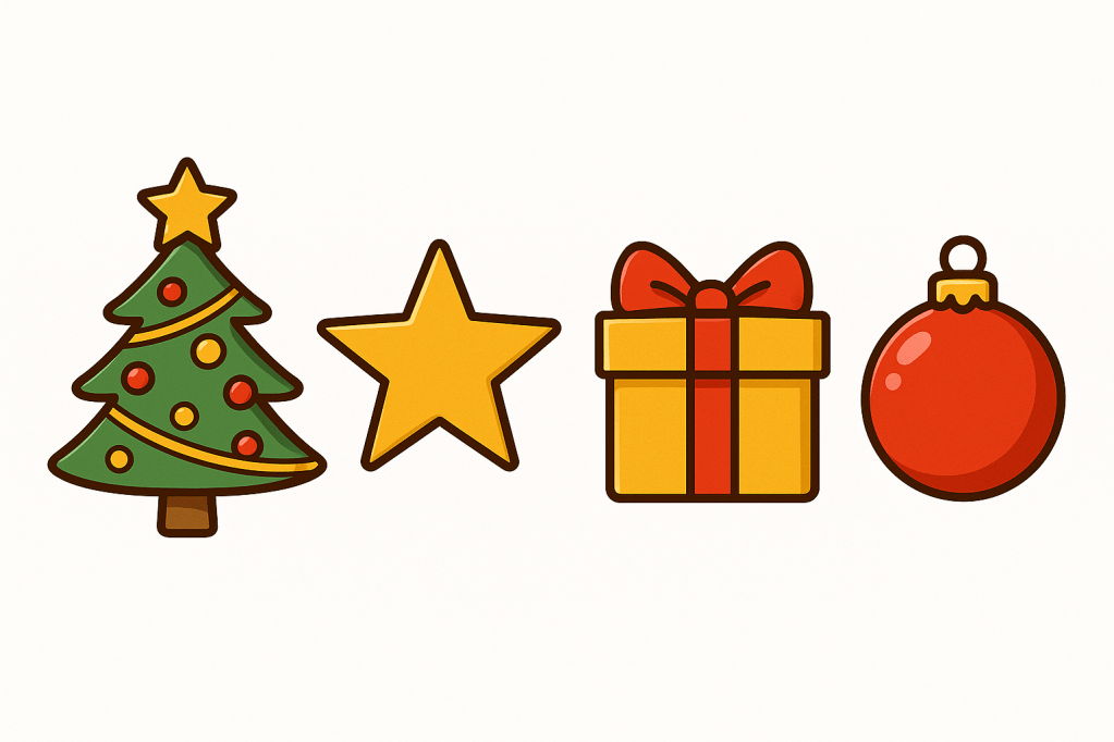 - obrazki: choinka, gwiazda, prezent, bombka,