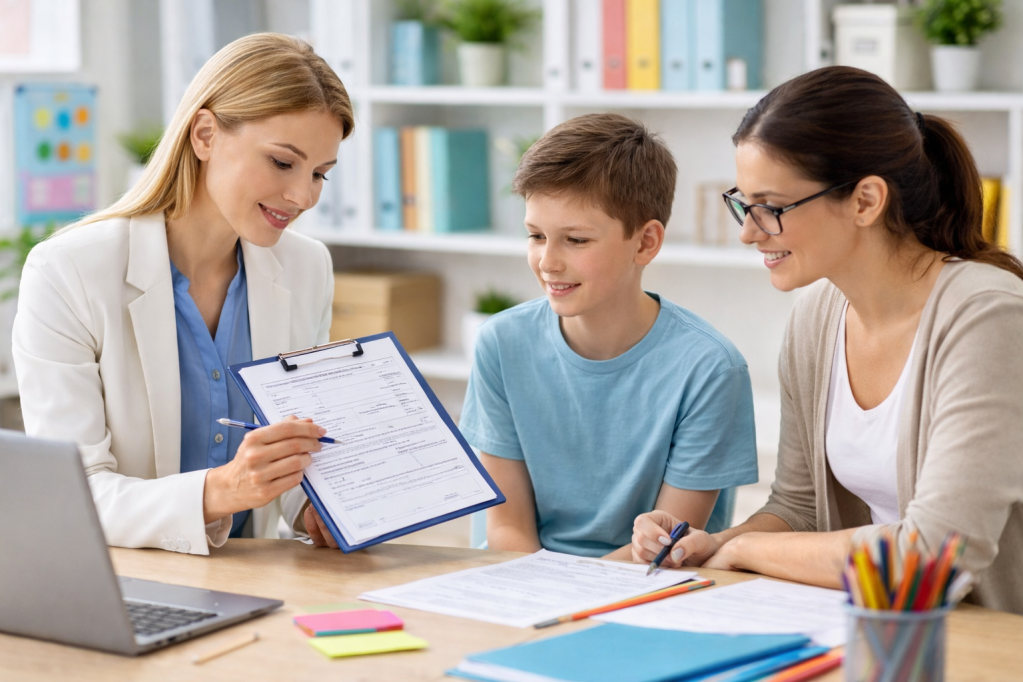 - dostosowania komunikacyjne (pytania zamknięte, wsparcie wizualne, wydłużony czas).
