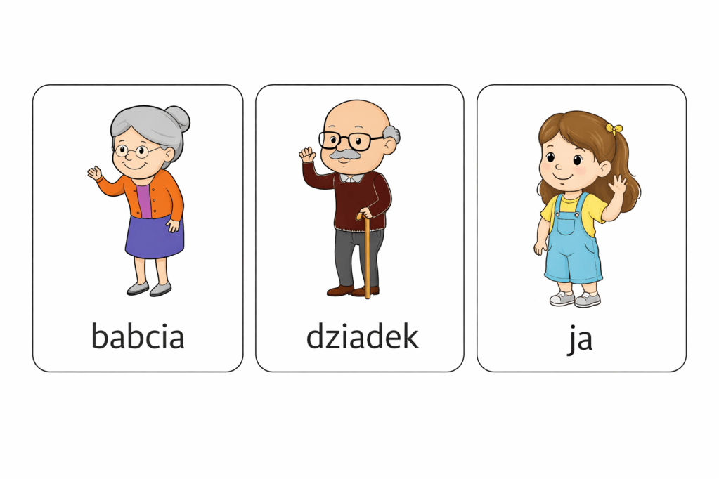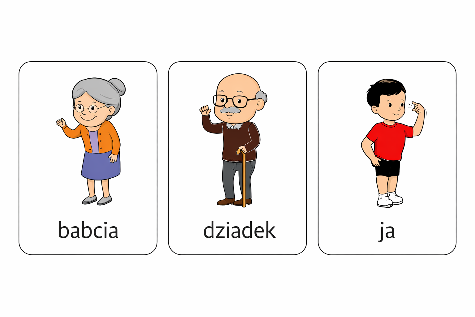 ➡️ Krótkie pokazanie kart PECS: babcia – dziadek – ja