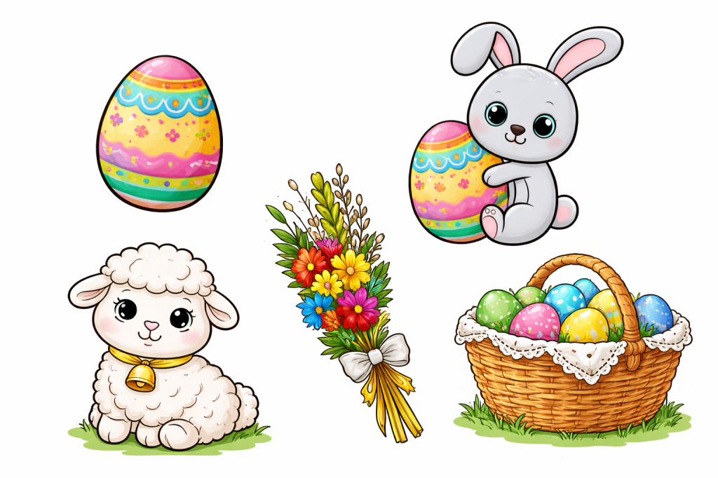 ✔ symbolach (jajko, baranek, koszyczek, zajączek)
