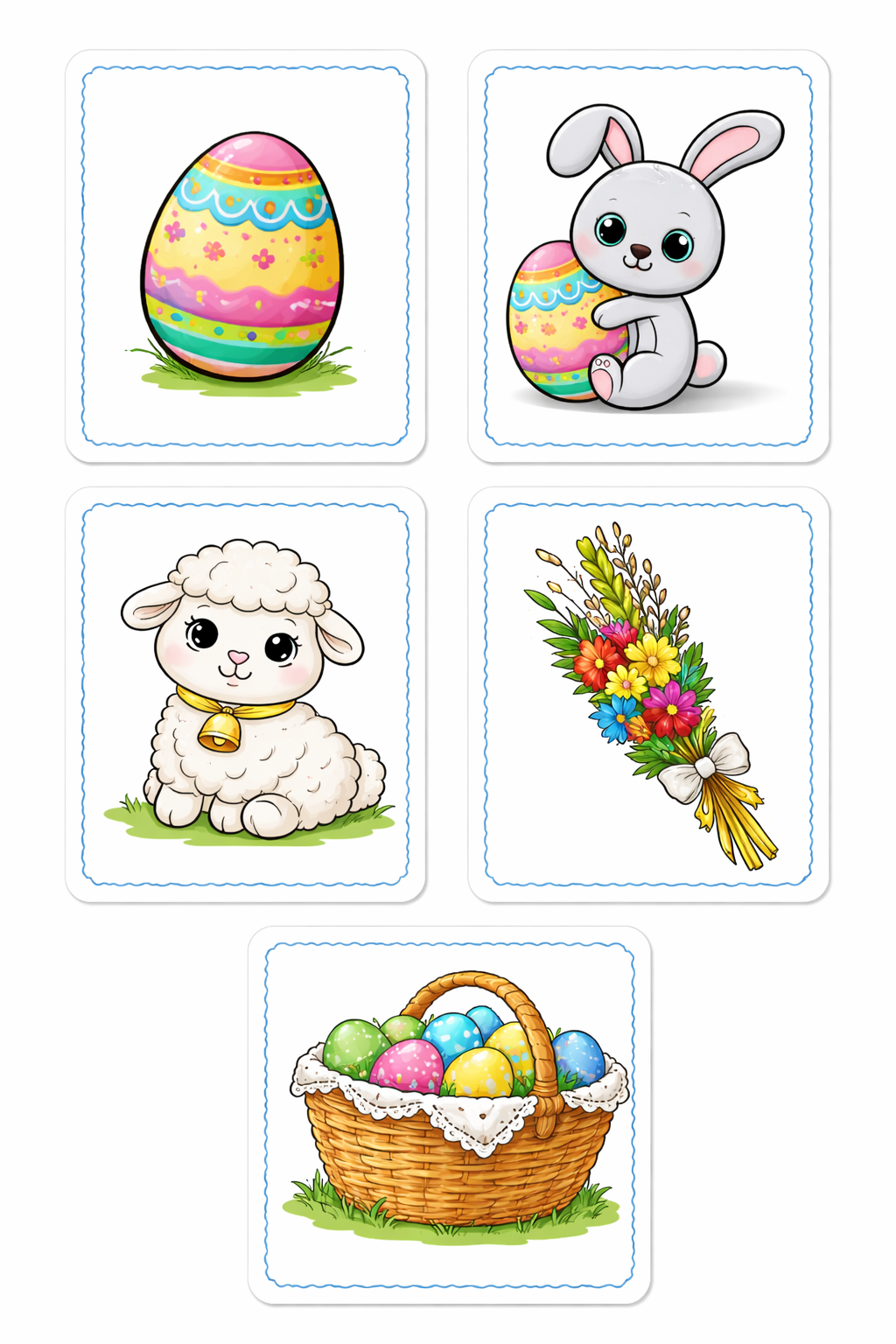 - obrazki: jajko, baranek, koszyczek, zajączek, palma