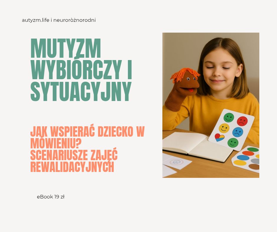 📘 „Mutyzm wybiórczy i sytuacyjny – Jak wspierać dziecko w mówieniu? Scenariusze zajęć rewalidacyjnych” to praktyczny eBook stworzony z myślą o nauczycielach, terapeutach i rodzicach dzieci z mutyzmem wybiórczym.